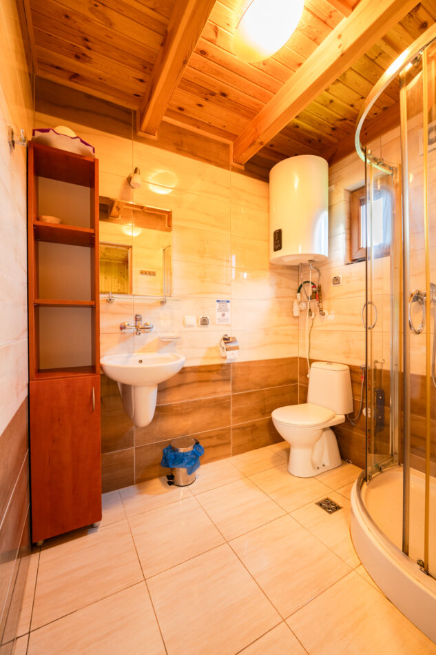 łazienka wyposażona w prysznic, umywalkę i toaletę, zapewniająca pełen komfort podczas pobytu.